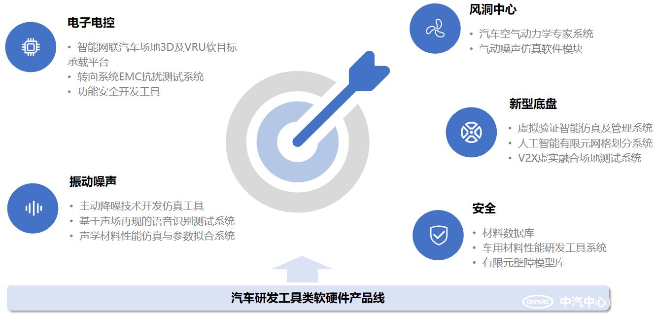 中汽中心工程院作為第三方汽車工程技術(shù)研發(fā)服務(wù)機構(gòu)高度重視并積極推動研發(fā)技術(shù)數(shù)字化轉(zhuǎn)型,整合自身業(yè)務(wù)積累數(shù)據(jù)與工程經(jīng)驗,以更大力度推進(jìn)數(shù)字化創(chuàng)新。開發(fā)具備自主知識產(chǎn)權(quán)的研發(fā)工具類軟硬件產(chǎn)品,推動業(yè)務(wù)結(jié)構(gòu)的轉(zhuǎn)型升級,加快形成圍繞電子電控、座艙聲音設(shè)計、汽車安全、網(wǎng)聯(lián)與底盤、節(jié)能、風(fēng)洞領(lǐng)域的數(shù)字化技術(shù)研發(fā)服務(wù)能力,全面提升企業(yè)研發(fā)設(shè)計的數(shù)智化水平。下圖即展示了各領(lǐng)域布局的產(chǎn)品線情況。