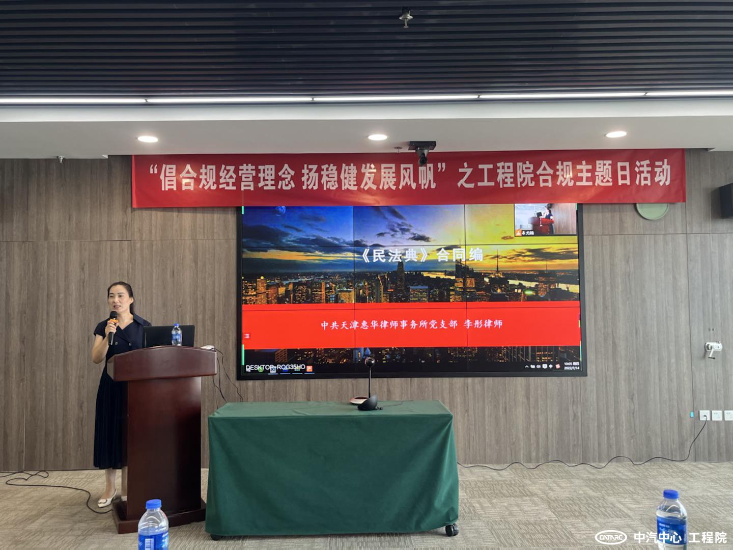7月14日上午,在中汽中心“合規(guī)文化周”期間,工程院開展“倡合規(guī)經(jīng)營理念 揚(yáng)穩(wěn)健發(fā)展風(fēng)帆”之子企業(yè)合規(guī)主題日活動。中汽中心法律事務(wù)與合規(guī)管理部總經(jīng)理孟巖,工程院黨委書記、總經(jīng)理王建海以及各部門負(fù)責(zé)人、項(xiàng)目經(jīng)理、市場經(jīng)理等人員參加本次活動。