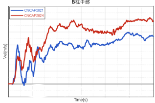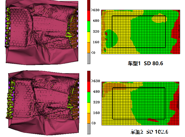 新型壁障SC-MDB的應用,對側面結構開發提出了新的挑戰。下圖是某2021版C-NCAP五星車型的側碰CAE結果對比。