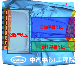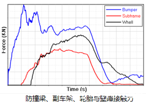MPDB碰撞過程中,壁障與防撞梁、副車架及輪胎結構產生接觸,如下圖所示。接觸產生較大的碰撞力,其中輪胎與壁障的接觸面積較大,受力平臺在60~80KN之間,高于副車架結構受力,對MPDB壁障產生的沖擊較大。不同接觸區域的車身結構剛度不同,導致壁障蜂窩鋁的變形出現不均勻現象,引起SD指標的變化。