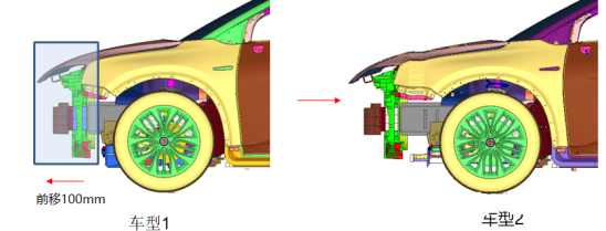 下圖是兩款不同結構車型的SD計算結果,其中車型1為含副車架傳力結構,車型2為不含副車架傳力結構。可以看出,增加副車架傳力通道后,SD指標可以從100mm降至80mm,改善效果非常明顯。