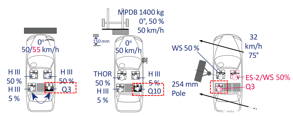 • 正碰碰撞速度調整為55km/h(0,1),碰撞能量增加,對于正向安裝的兒童座椅,其碰撞能量傳遞與釋放成為重難點;