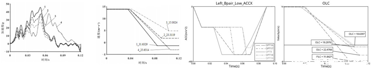 動態仿真開發方面,針對正碰碰撞速度提升問題,分析加載脈沖變化,重點解析加載脈沖幅值-波寬-時刻對假人傷害的影響情況,以備針對不同車型進行專項優化分析。